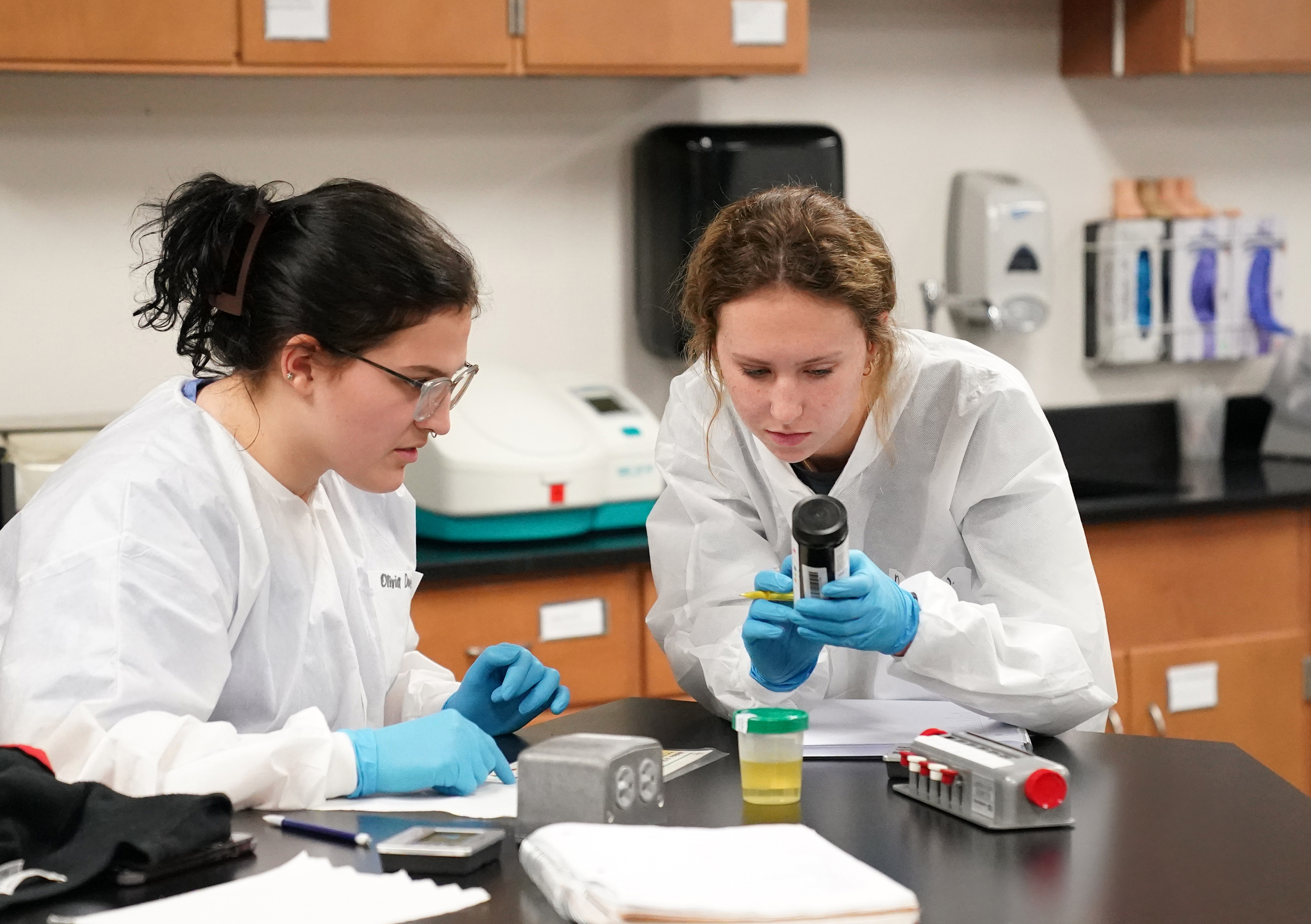 Medical Laboratory Technician student Mariah Schneider, of Wellfleet, prepares to draw blood from Kylie Licking, of Seneca, Wednesday in the North Platte Community College Health and Science Center.