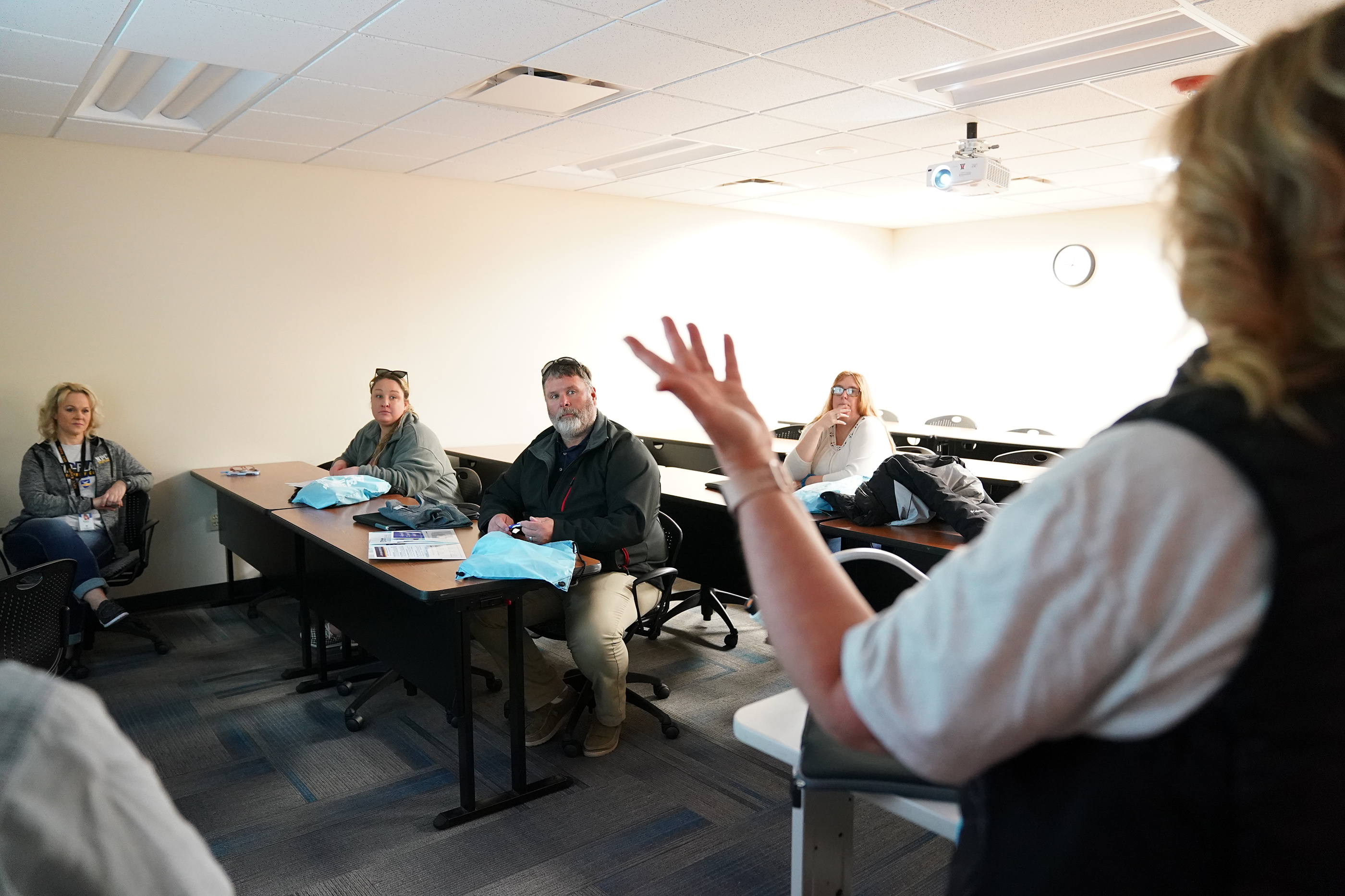 Visitors listen as the contents of welcome packets are explained during a Non-Traditional Student College and Career Exploration event at North Platte Community College Saturday afternoon.
